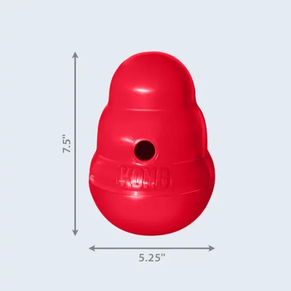 The KONG Wobbler™ is an action-packed toy that is a mentally stimulating food dispenser. The KONG-shaped toy sits upright until nudged by the dog’s paw or nose, dispensing tasty rewards as it wobbles, spins, and rolls. The unpredictable movement stimulates natural instincts keeping even the most seasoned users challenged.